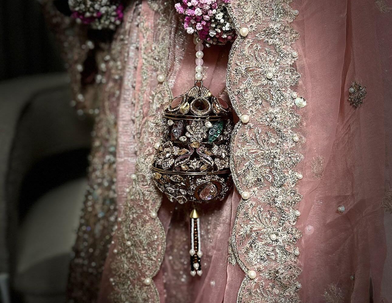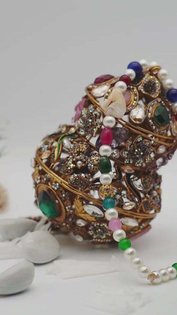 Intricately embellished with sparkling crystal floral motifs, lustrous pearl cascades, and fine golden detailing -