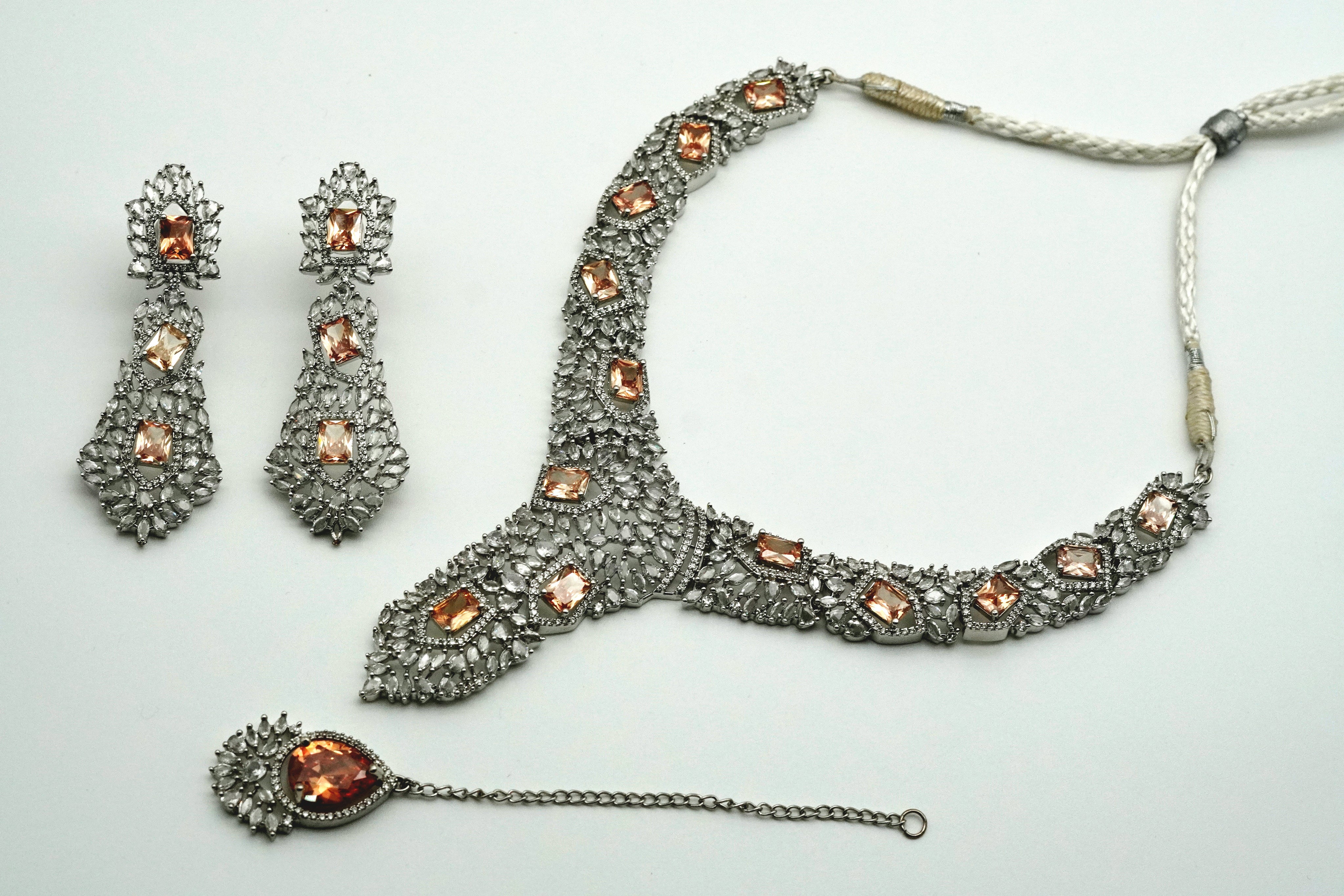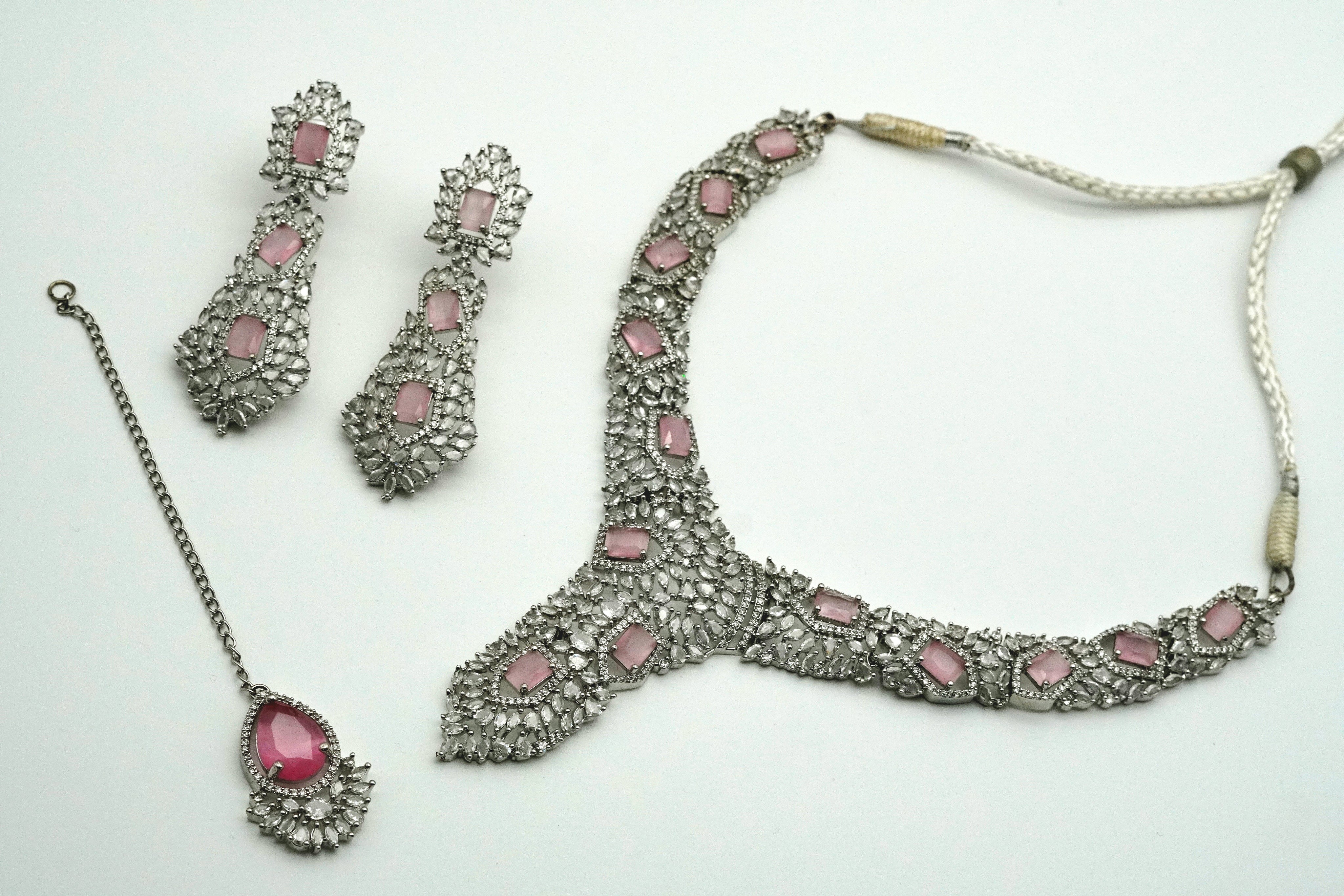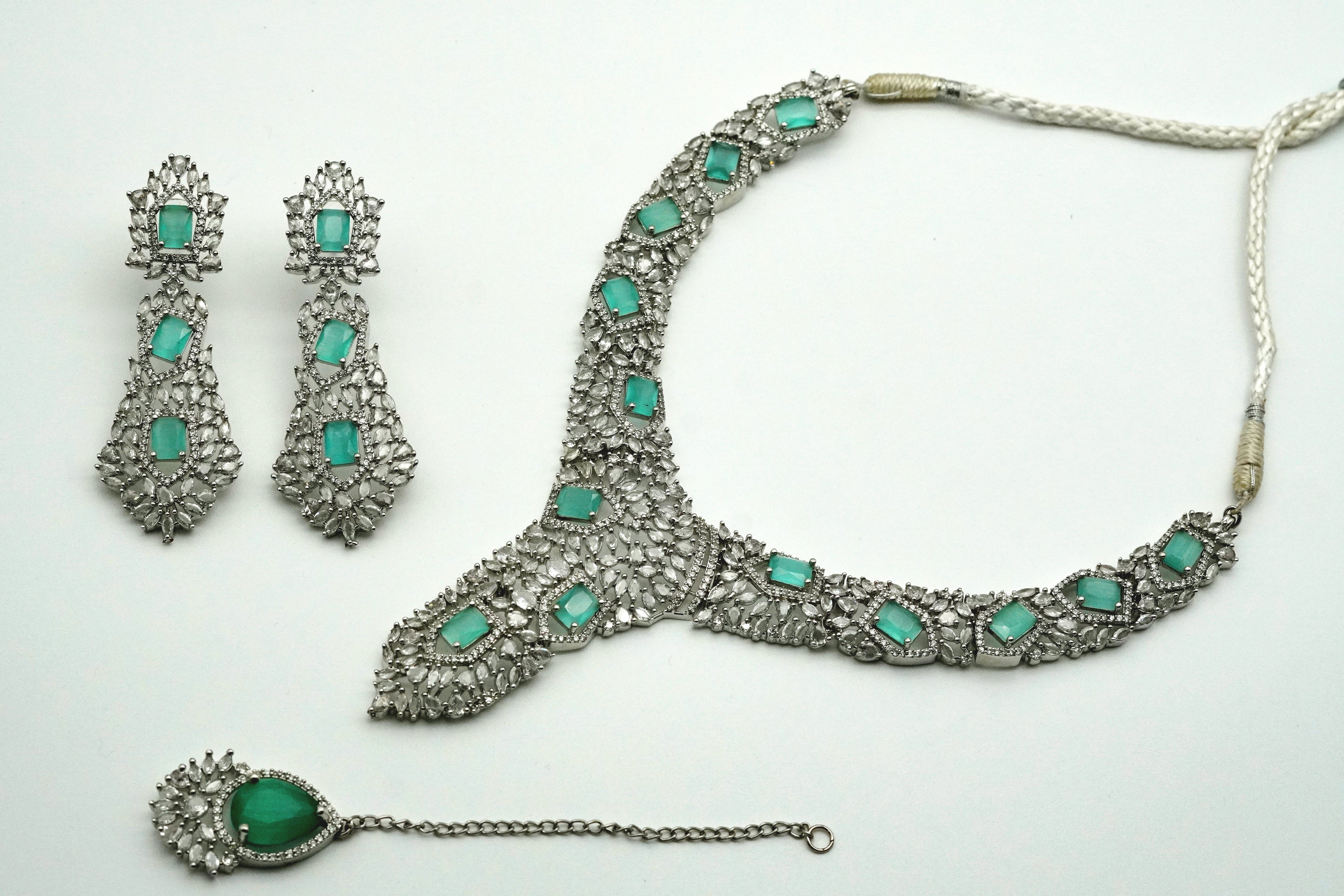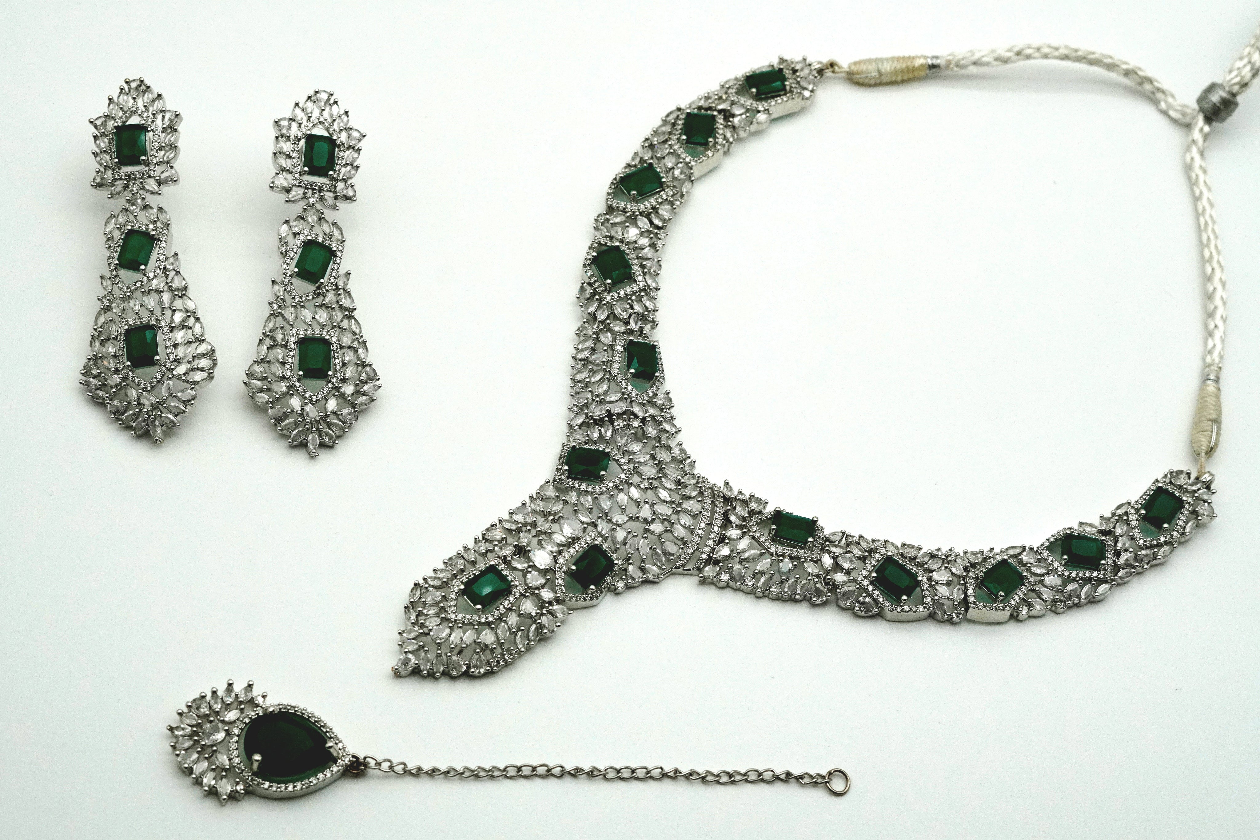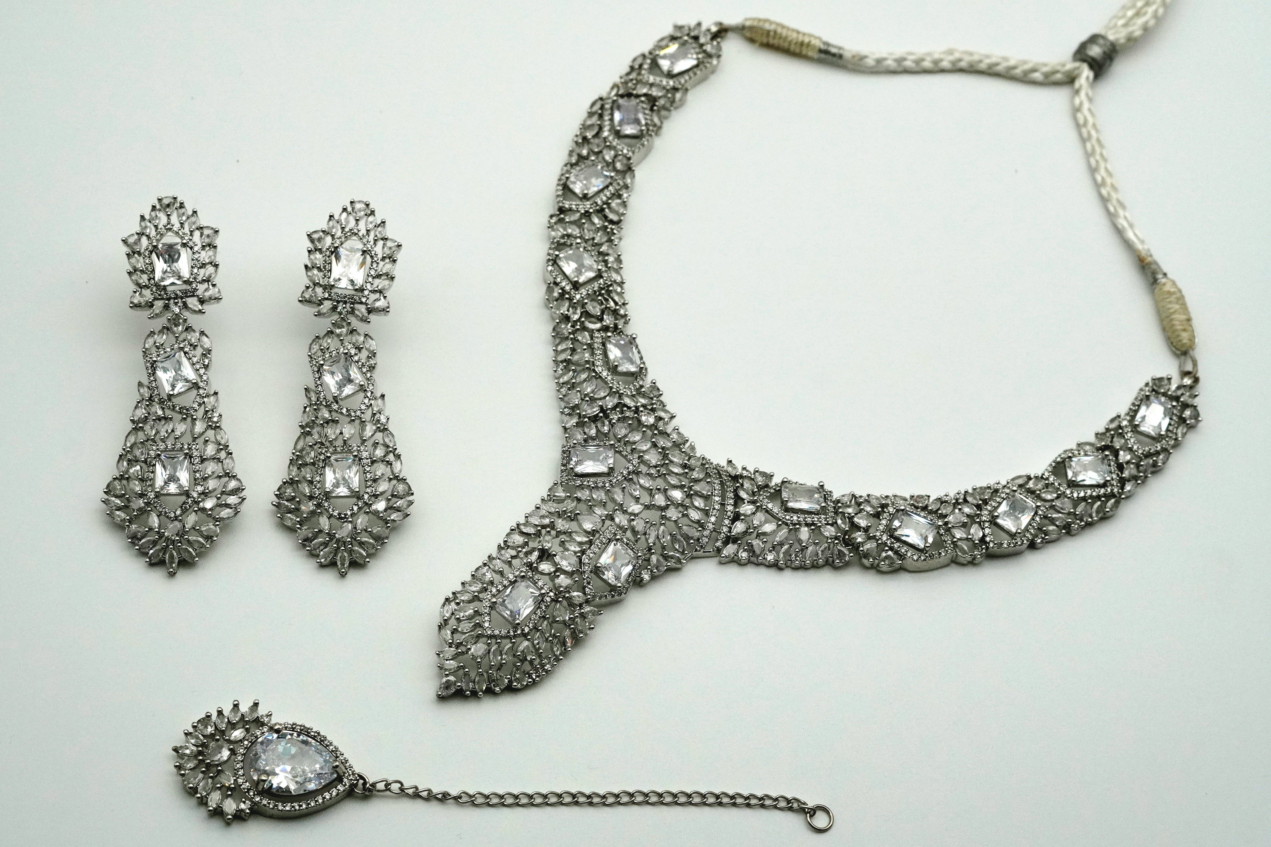 Embrace timeless elegance with this exquisite AD jewellery set from LayLay By Mariam. Designed for the modern woman who adores a touch of regal charm, this set includes a statement necklace, matching earrings, and a delicately crafted tikka — each piece meticulously adorned with sparkling AD stones that shimmer with every movement.