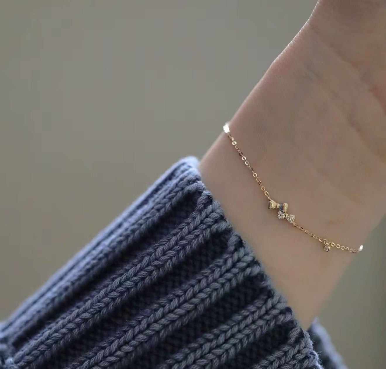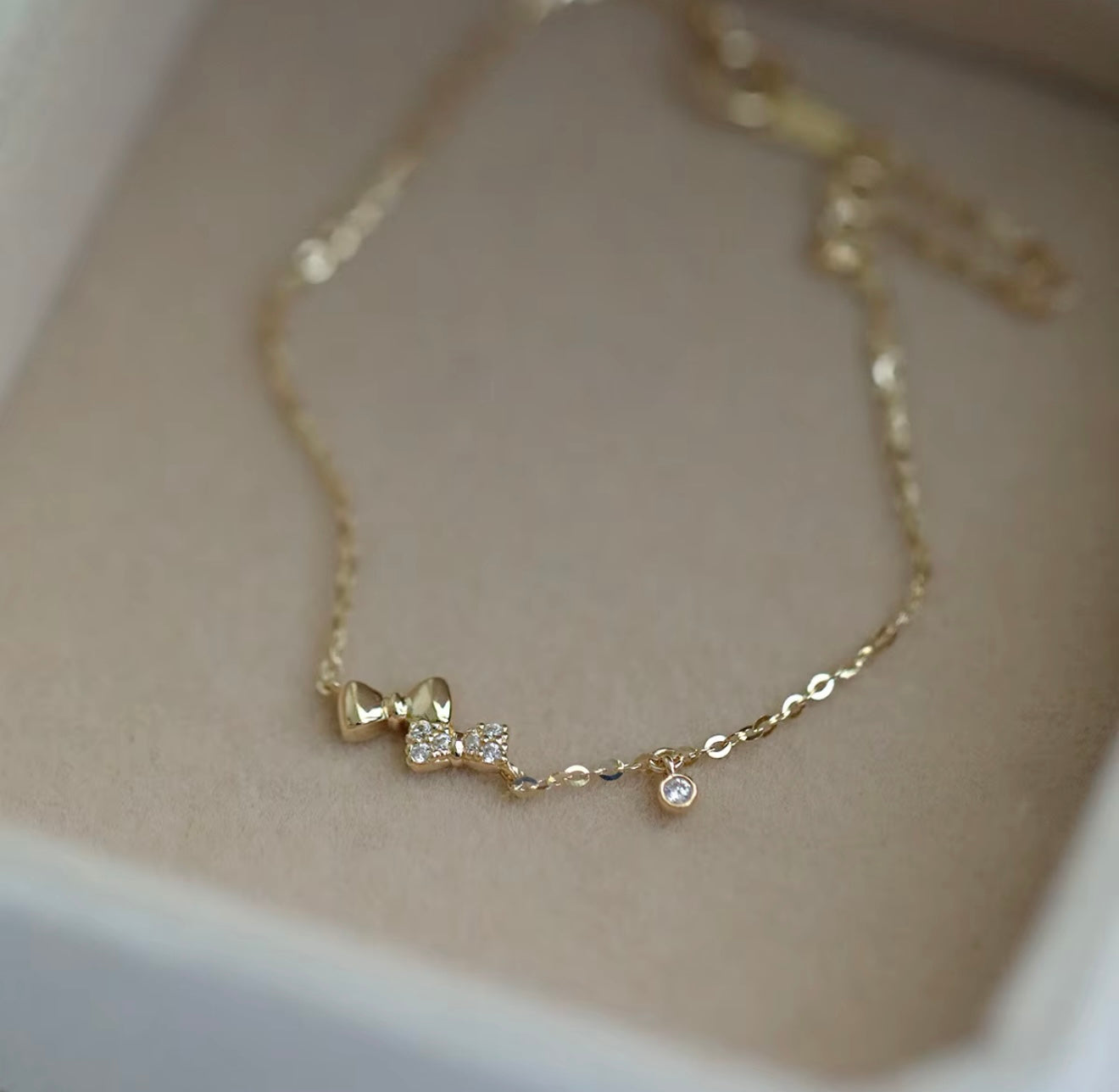 Charming, feminine, and beautifully understated — this 14K gold plated bracelet features a delicate bow charm adorned with tiny cubic zirconia stones for a subtle sparkle. The minimalist chain includes a single dangling crystal, adding just the right touch of elegance.