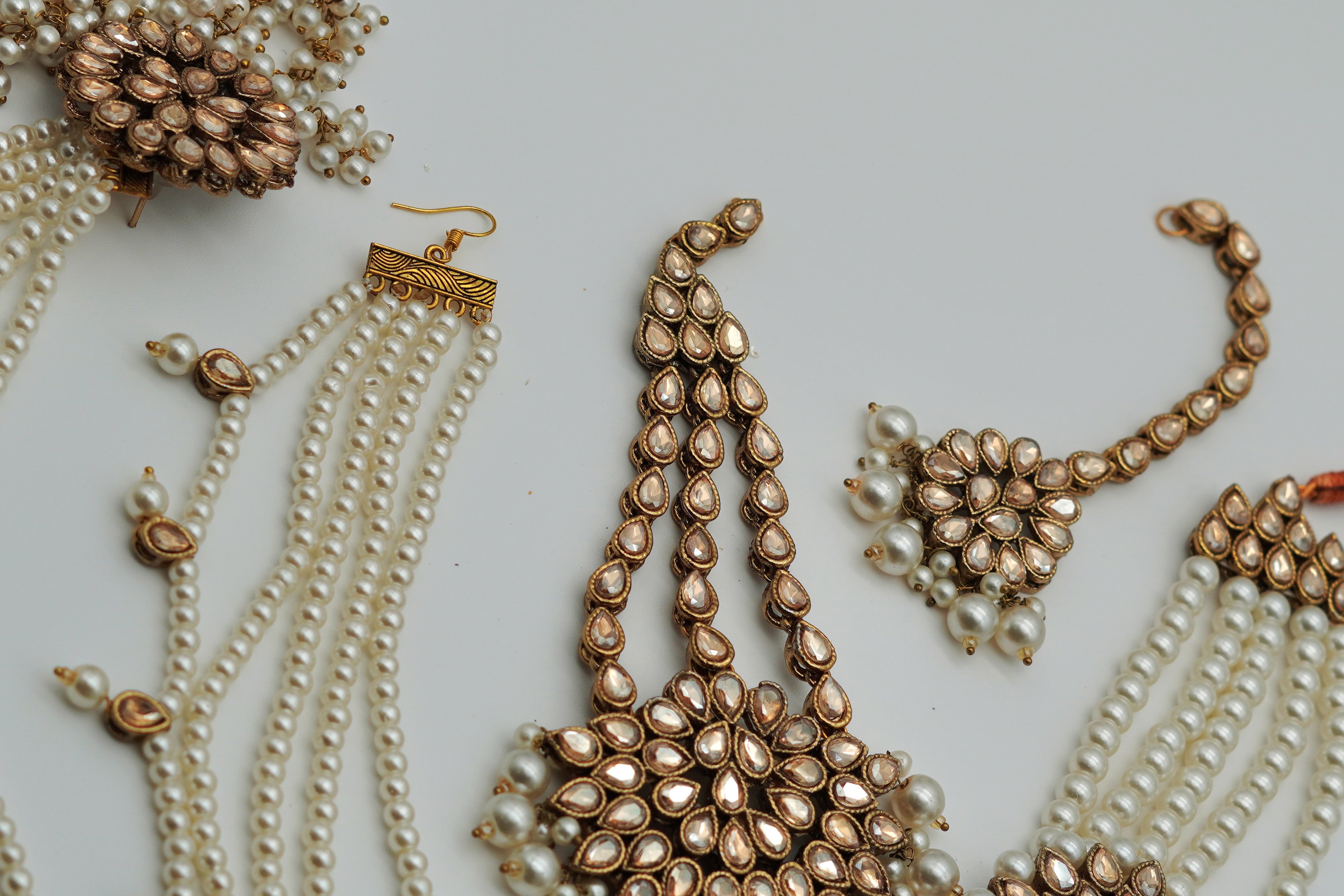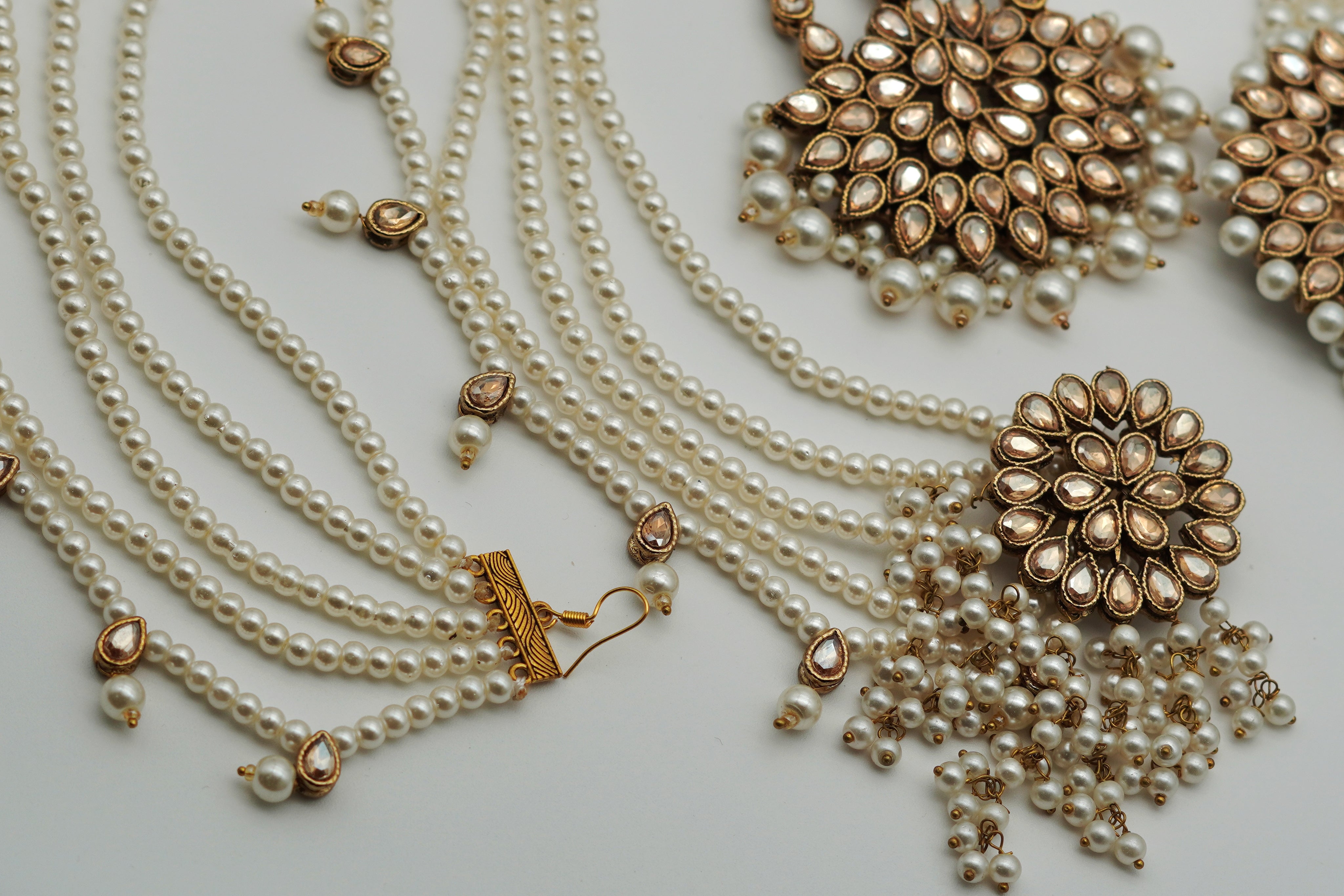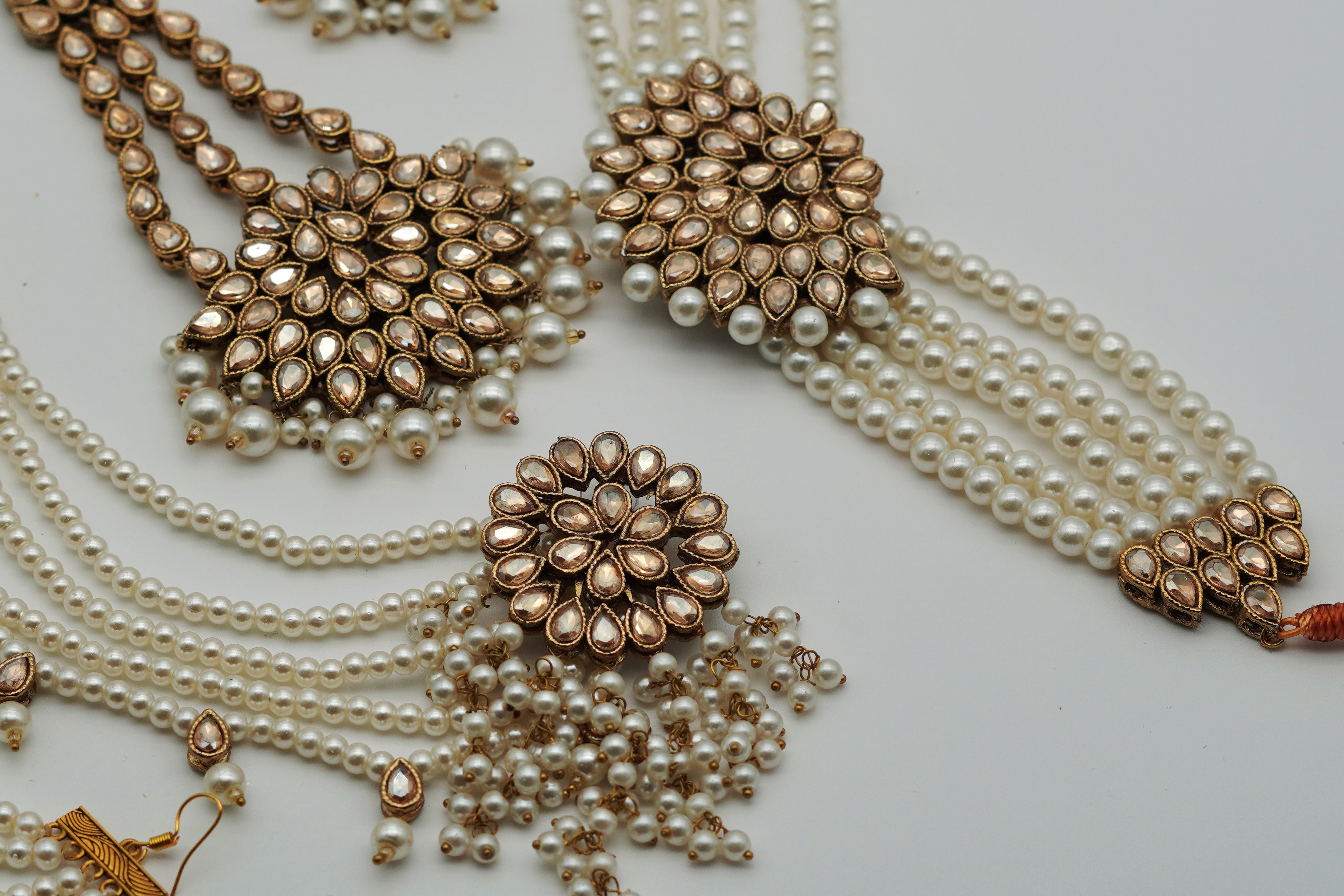 Comes as a complete set: tikka, jhumar, earrings with sahare, choker, and mala