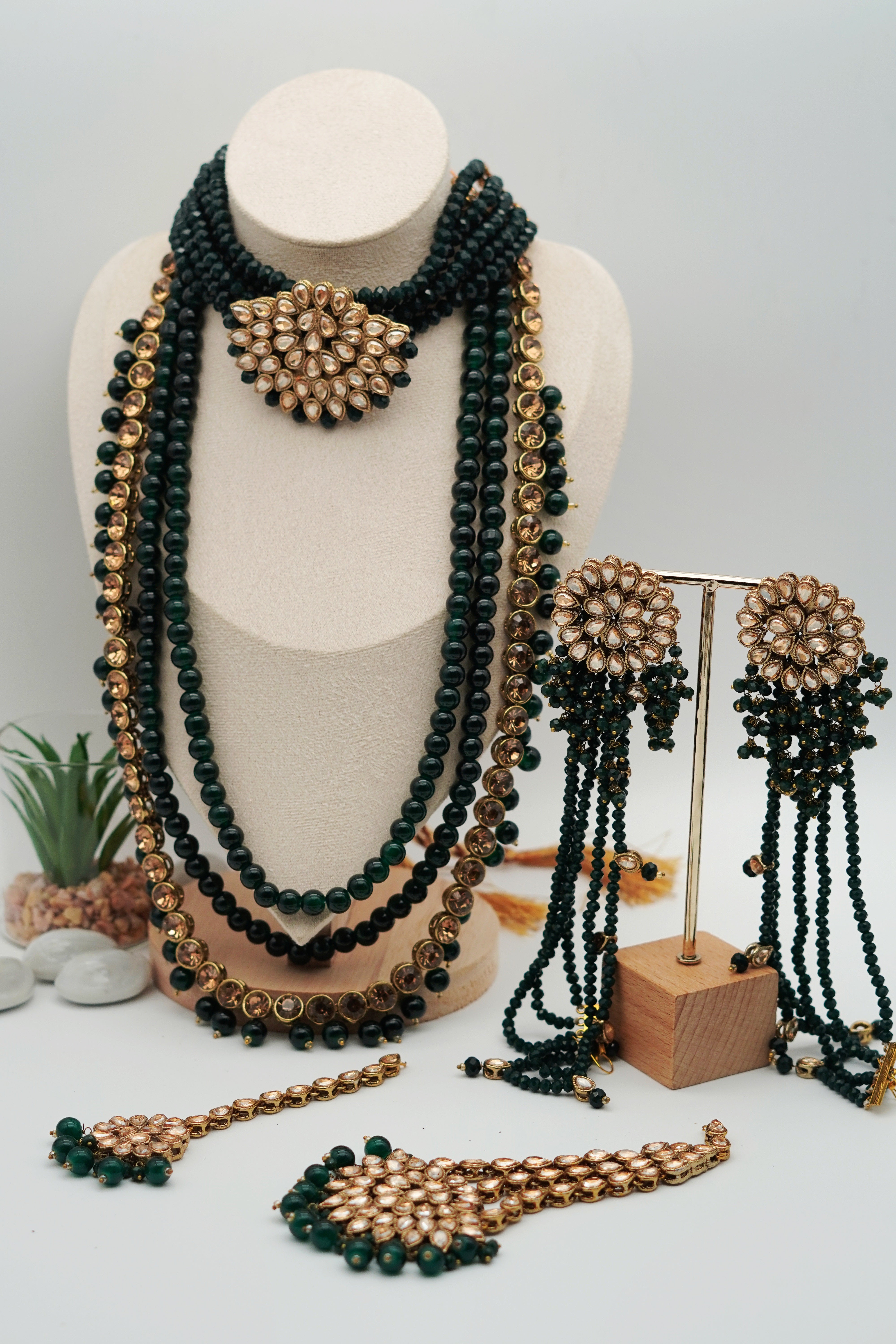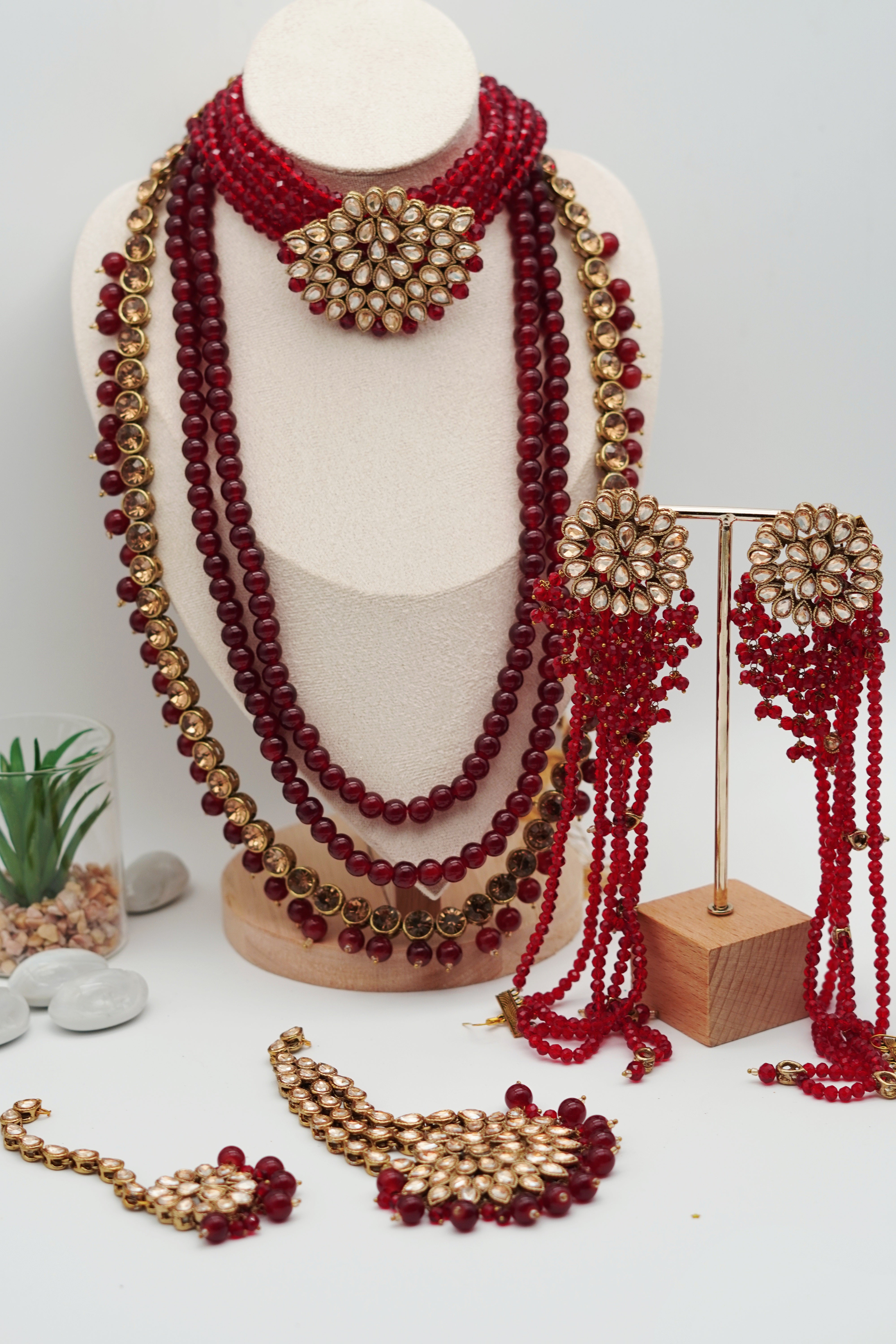 The full ensemble includes a tikka, jhumar, earrings with sahare, a choker, and a layered mala — thoughtfully coordinated to create a cohesive look that exudes grandeur.