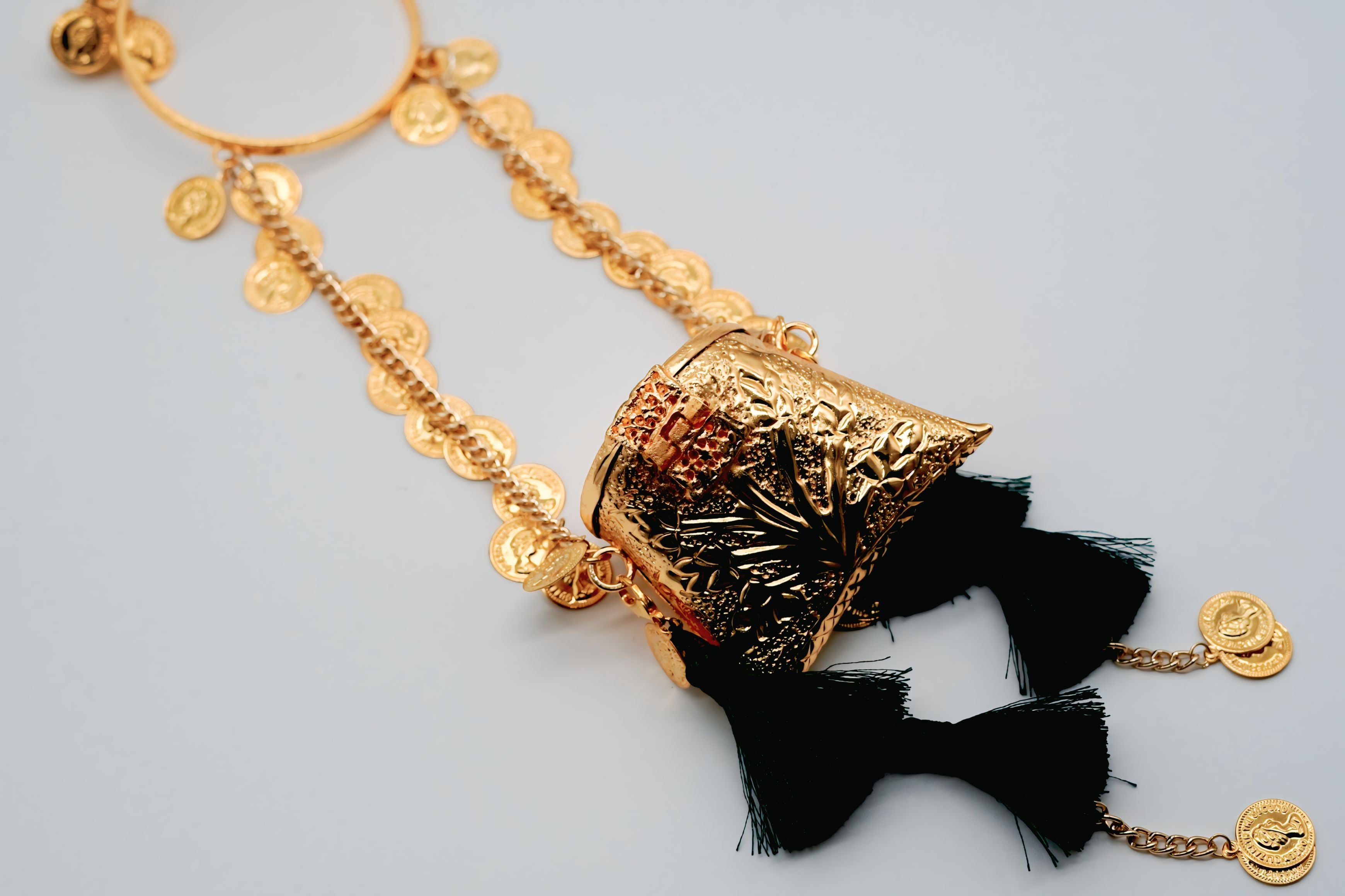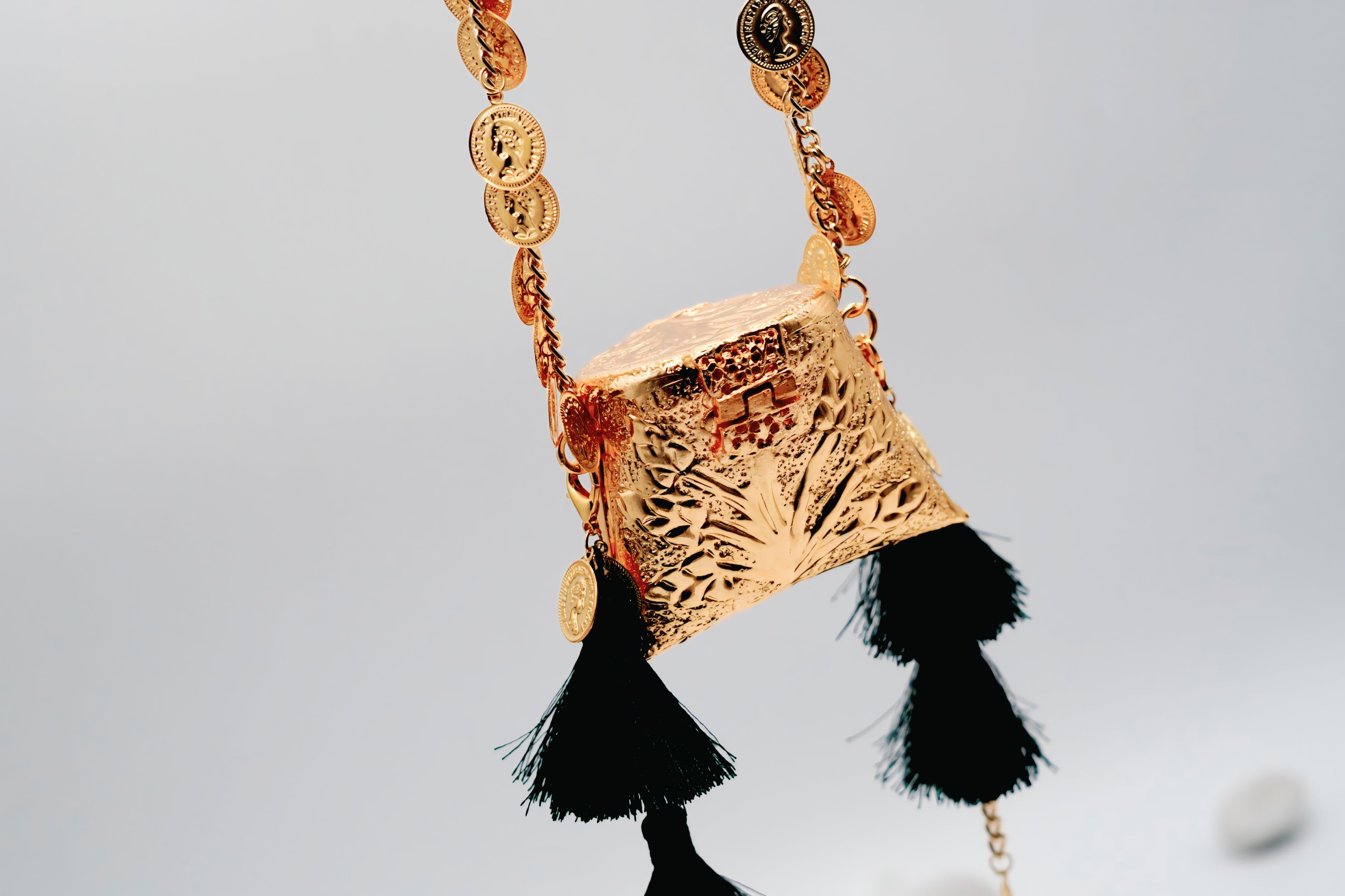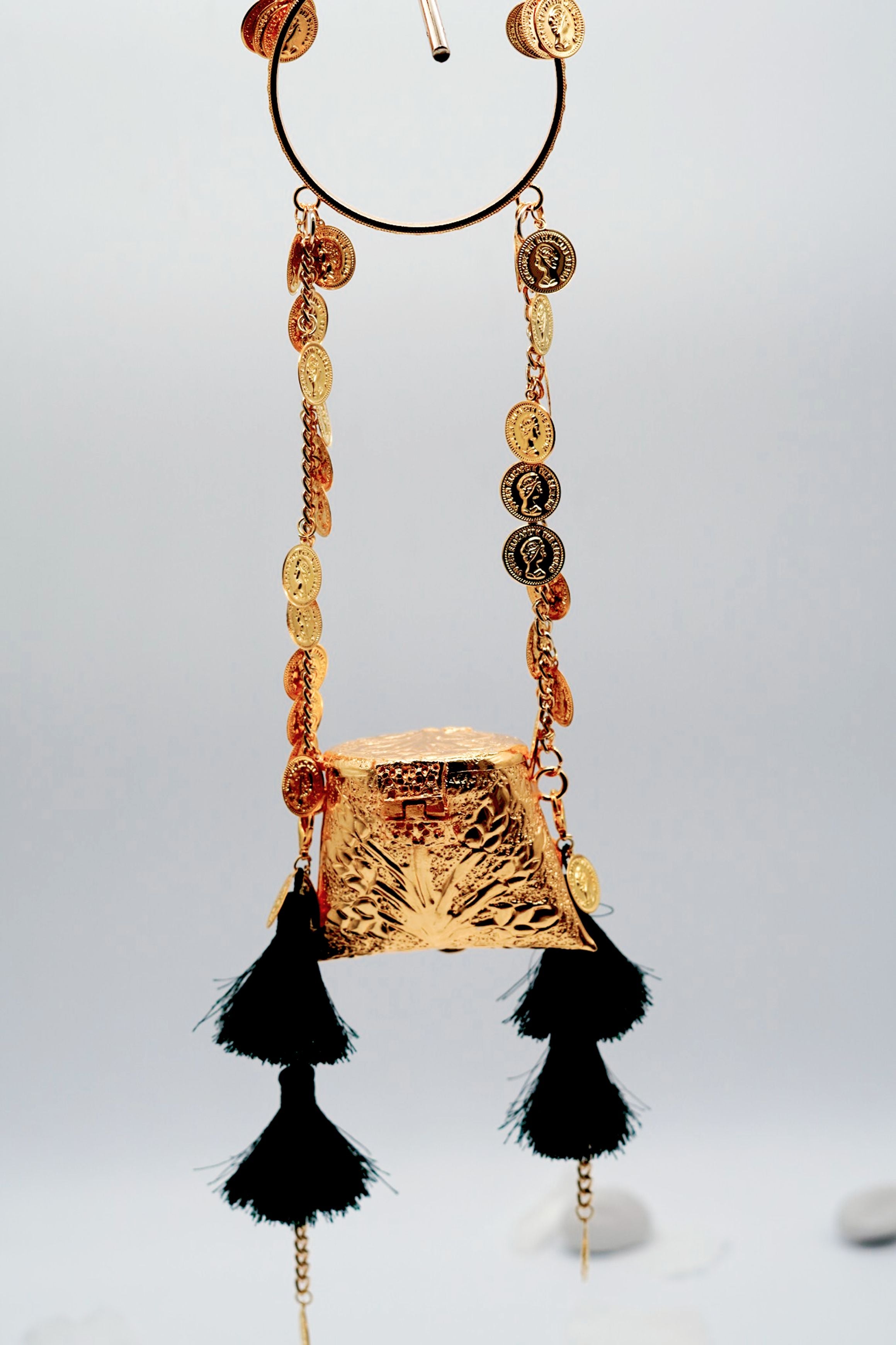 Adorned with delicate coin-embellished chains and finished with bold black tassels, it captures a perfect balance of opulence and charm. Whether worn as a standout jewelry piece or carried as a fashion-forward accent, this nano bag adds a touch of regal sophistication to any outfit.