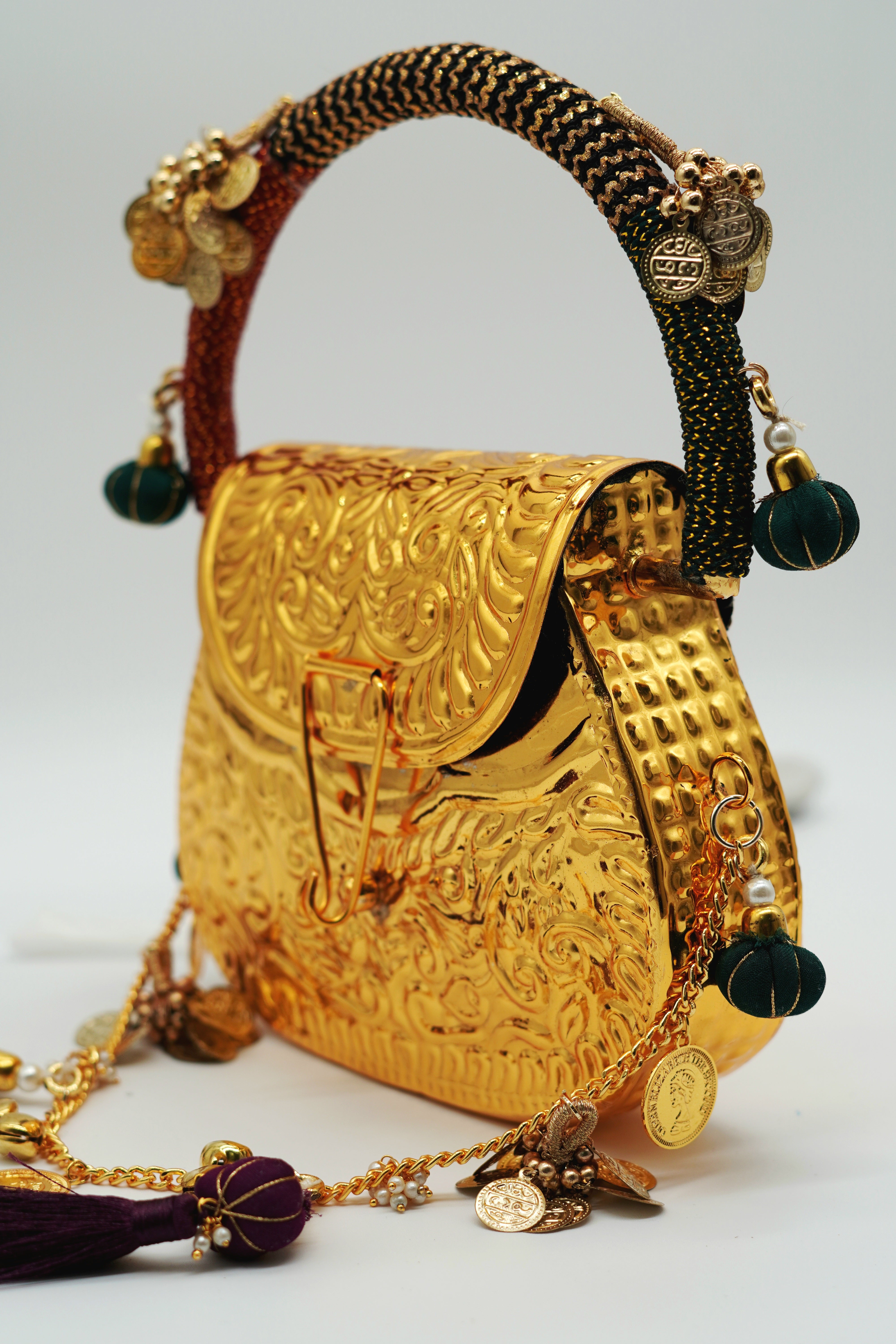 Accents: Hand-beaded handle, coins, pearls & fabric tasselsColors: Antique gold, maroon, emerald, and bronze