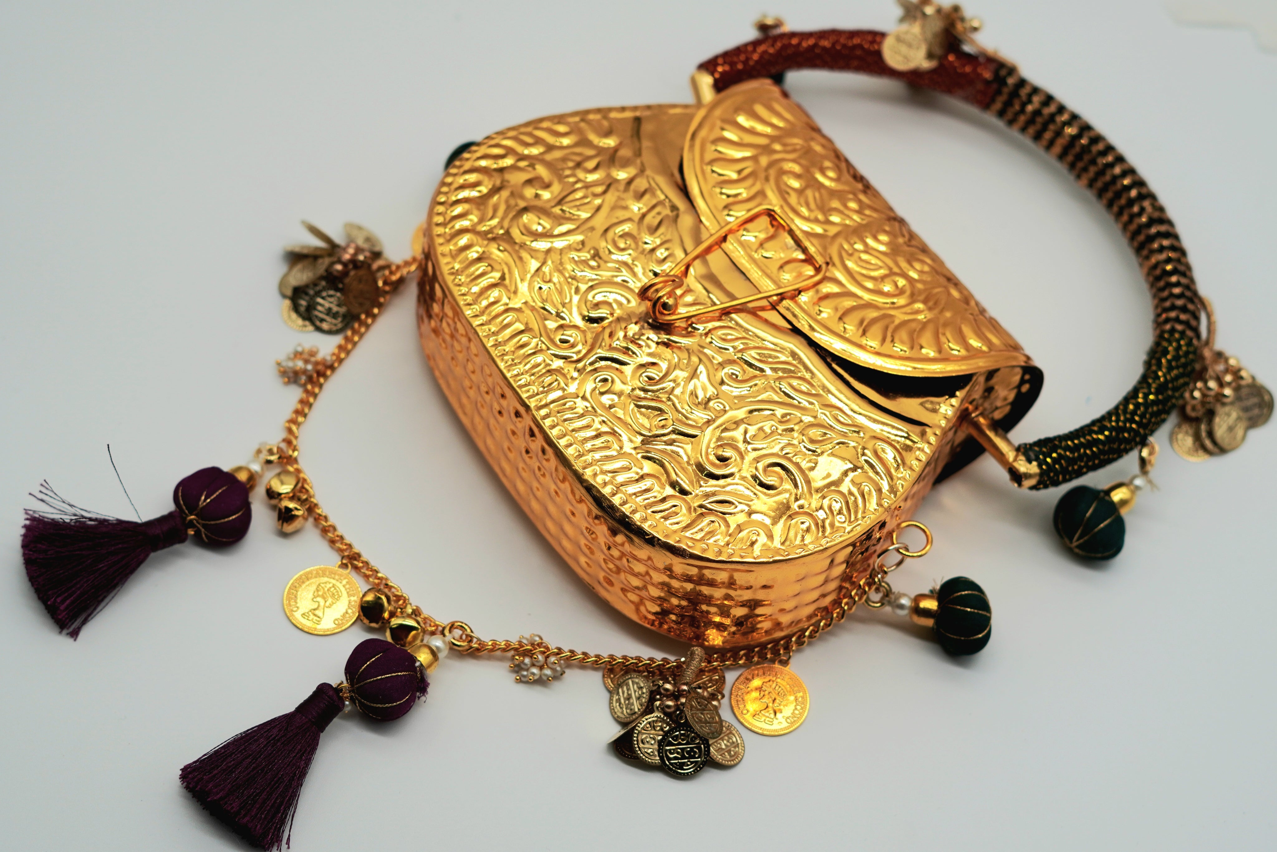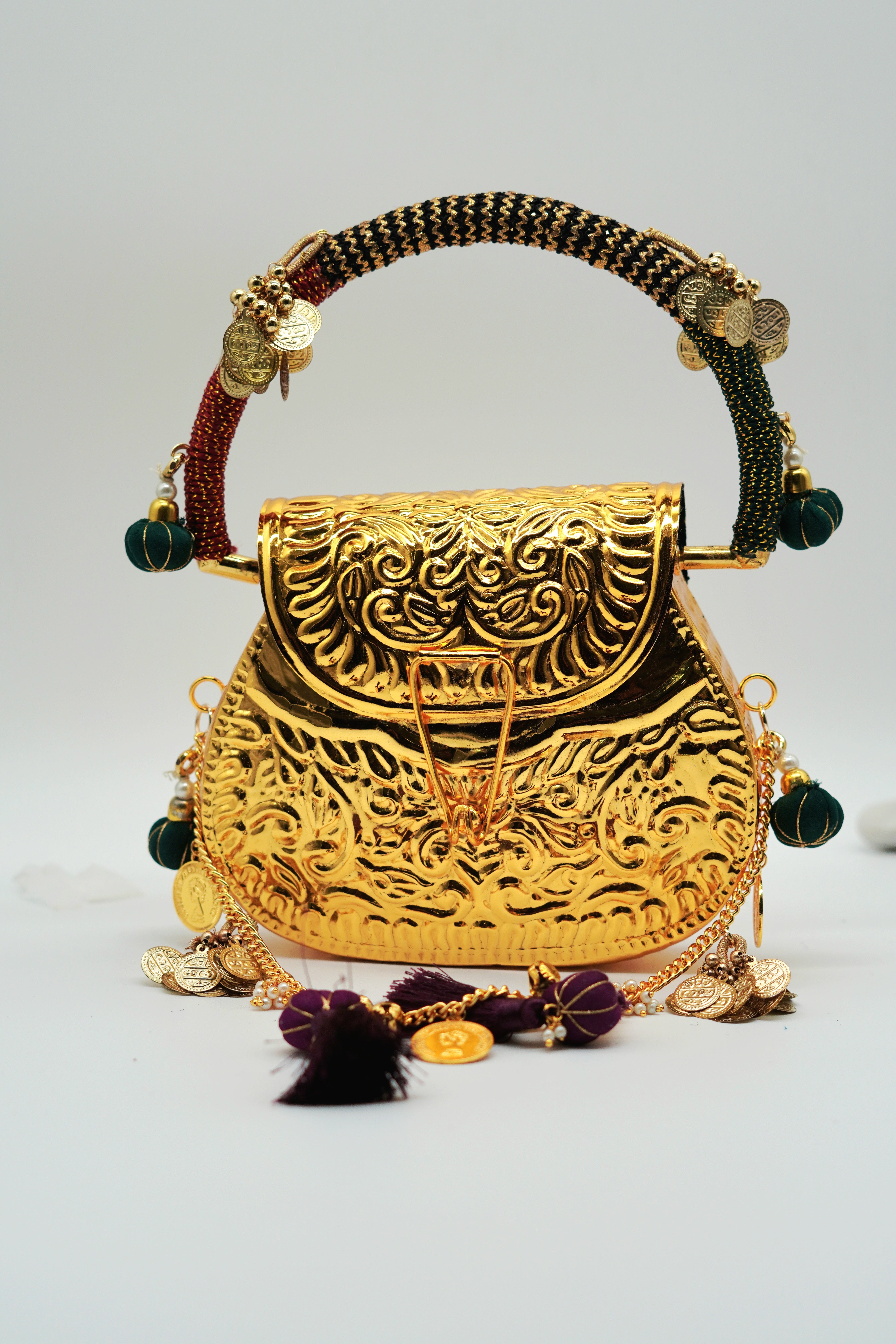 Step into the world of timeless opulence with Golden Mirage, a handcrafted statement clutch that captures the spirit of royal grandeur. Sculpted in radiant gold-toned metal, every curve of this piece tells a story of intricate craftsmanship and cultural artistry. The embossed floral patterns shimmer with depth, while the antique-inspired clasp adds a touch of old-world sophistication.