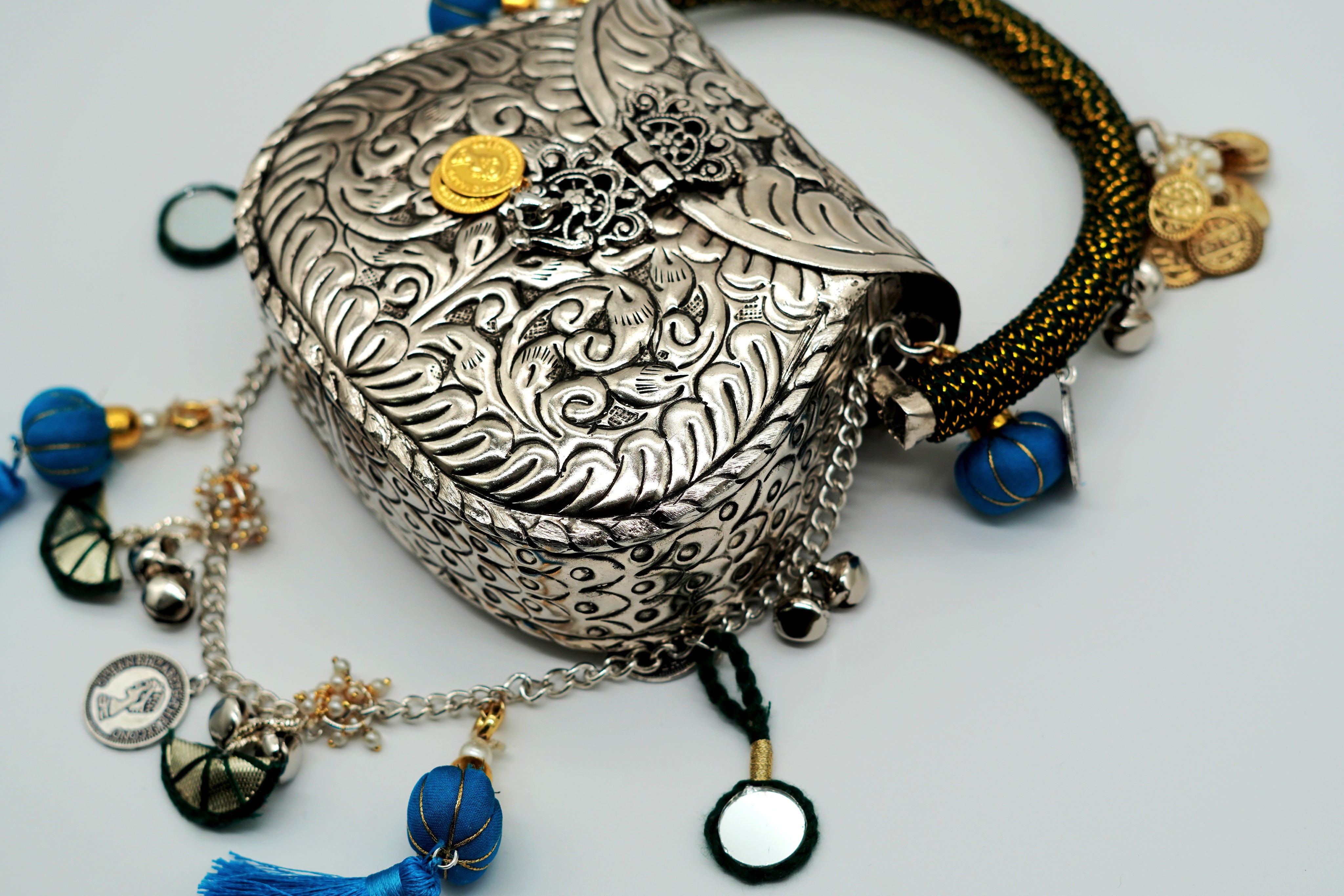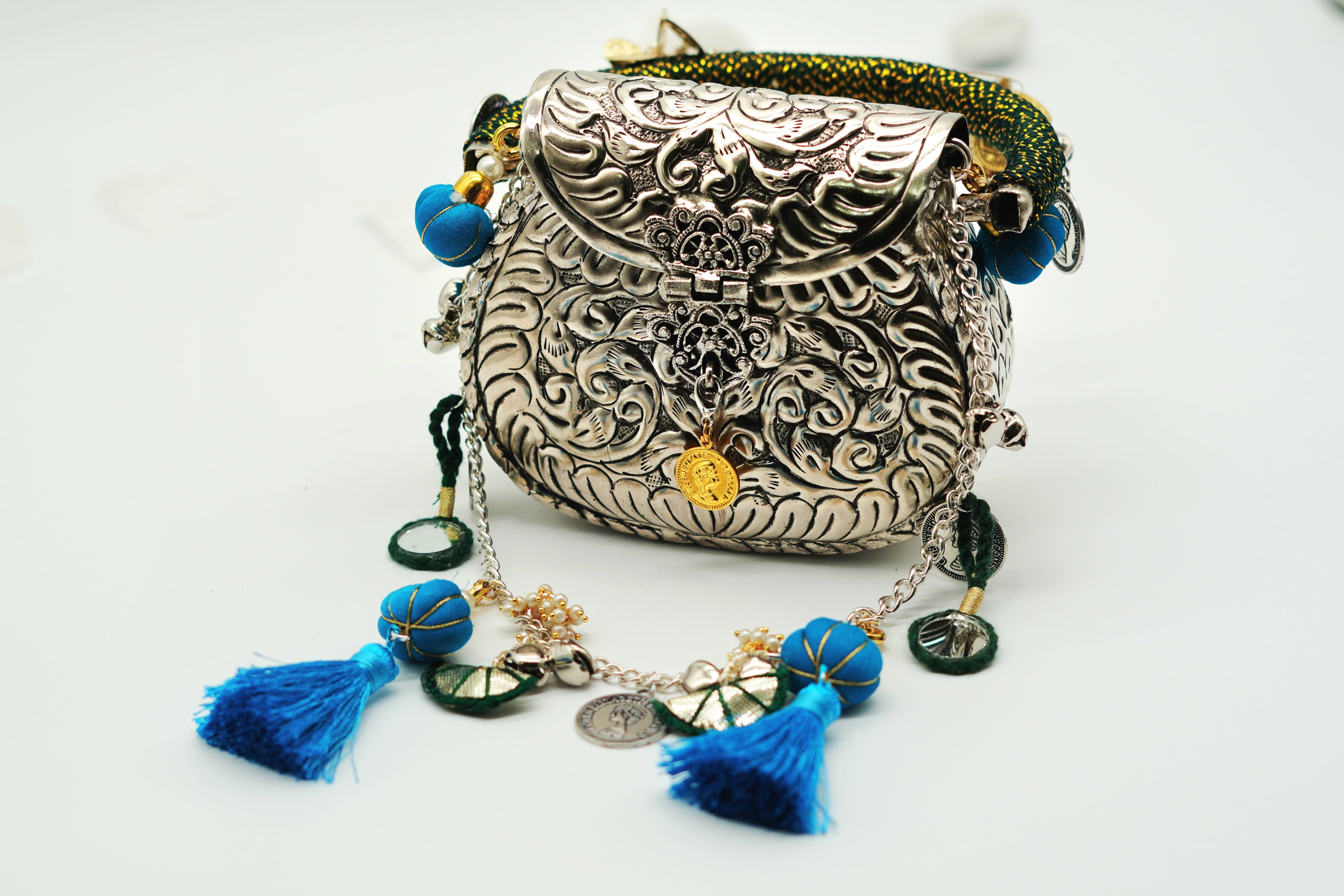 A statement of heritage and modern artistry, The Silver Odyssey is not just a bag — it’s wearable art. Handcrafted in intricately embossed silver-toned metal, this piece radiates regal allure with its baroque floral motifs and ornate clasp detailing.