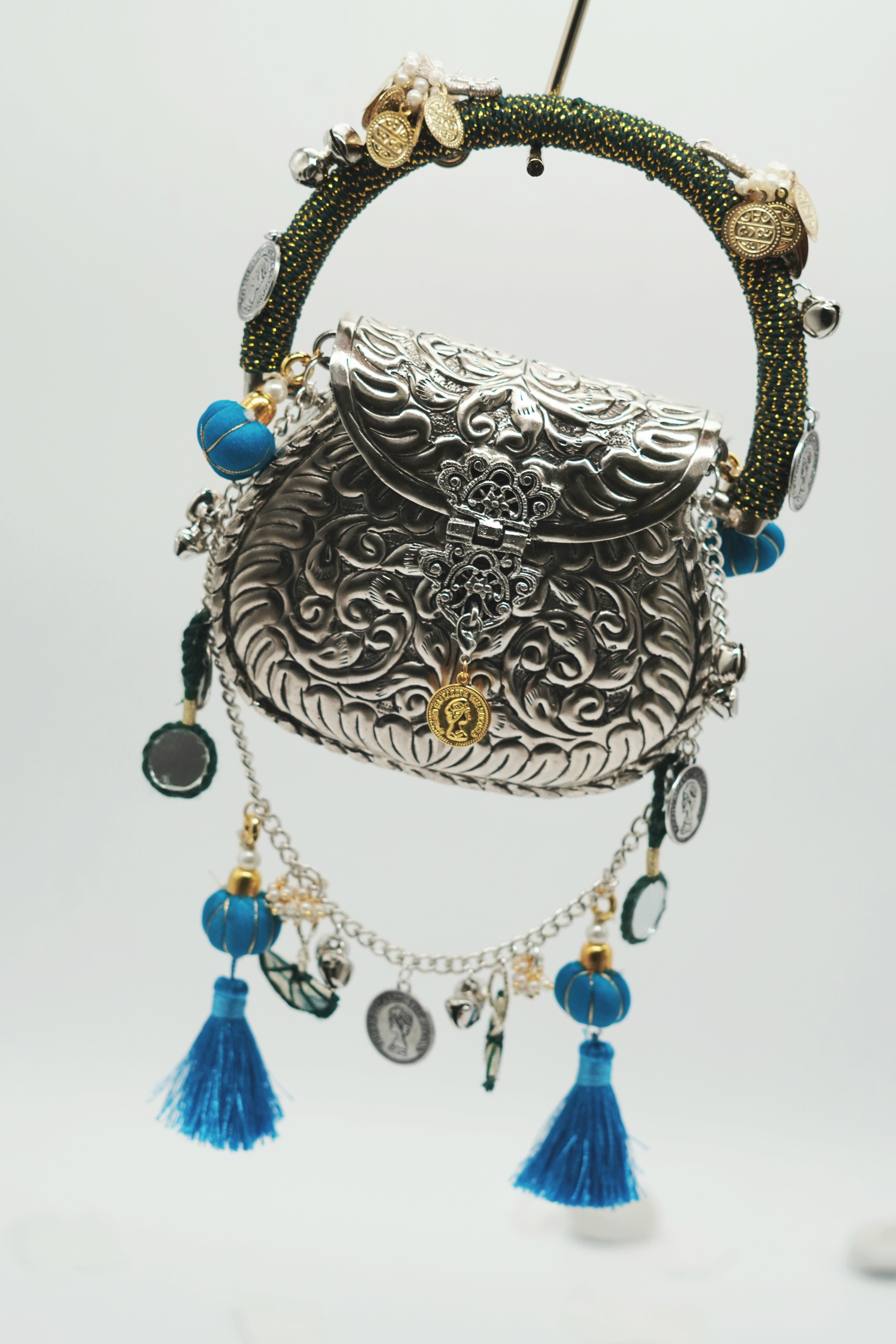 The handle is a masterpiece of texture — wrapped in rich green beading and adorned with gold charms, pearls, and metallic medallions that echo tales of timeless craftsmanship. Dangling blue tassels and embroidered fabric beads bring a vibrant contrast, blending old-world elegance with bohemian charm.