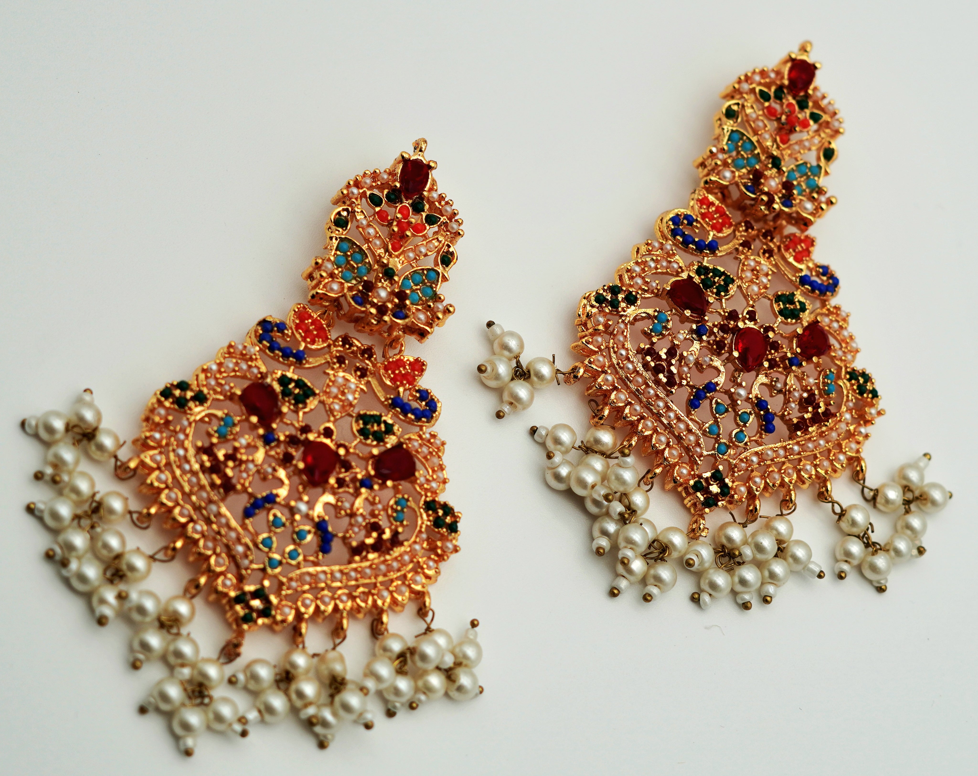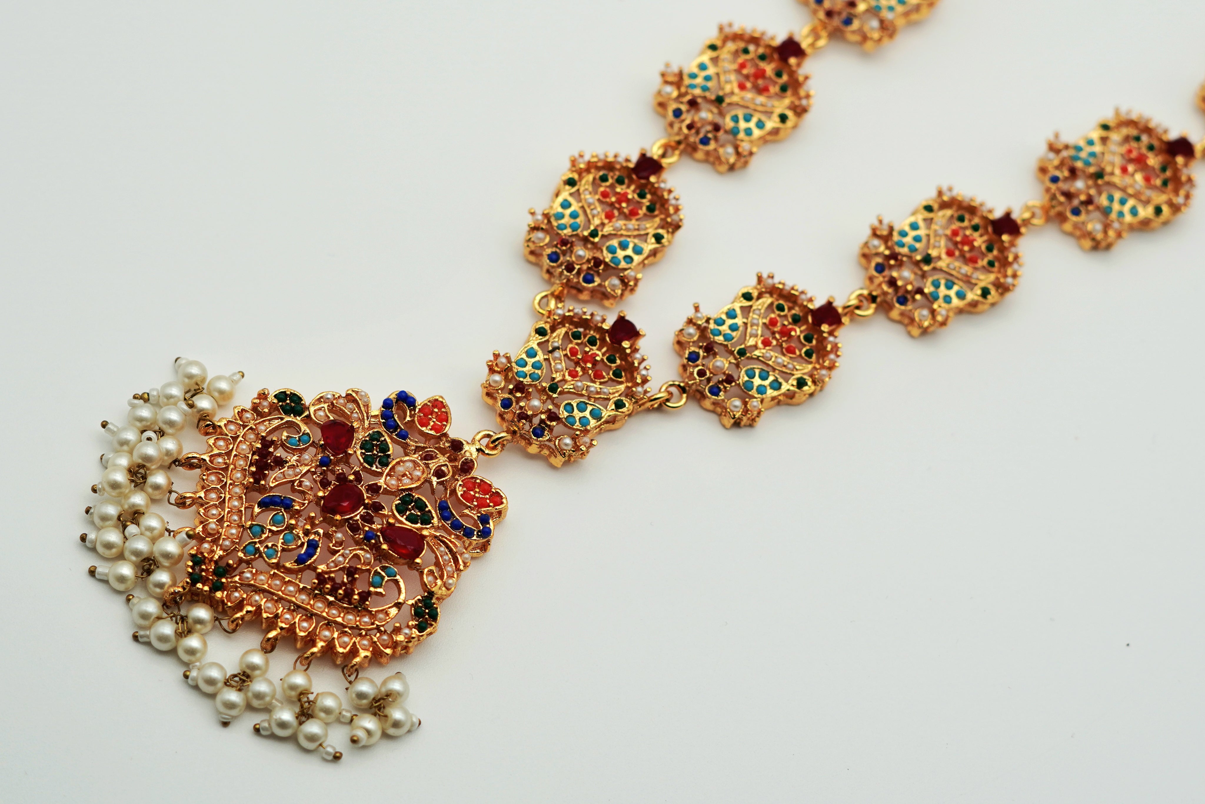 Each piece in this exquisite collection is intricately detailed with handcrafted filigree work, embellished with multi-colored gemstones that radiate a royal allure. The design is completed with delicate clusters of luminous pearls, adding a soft, graceful finish.