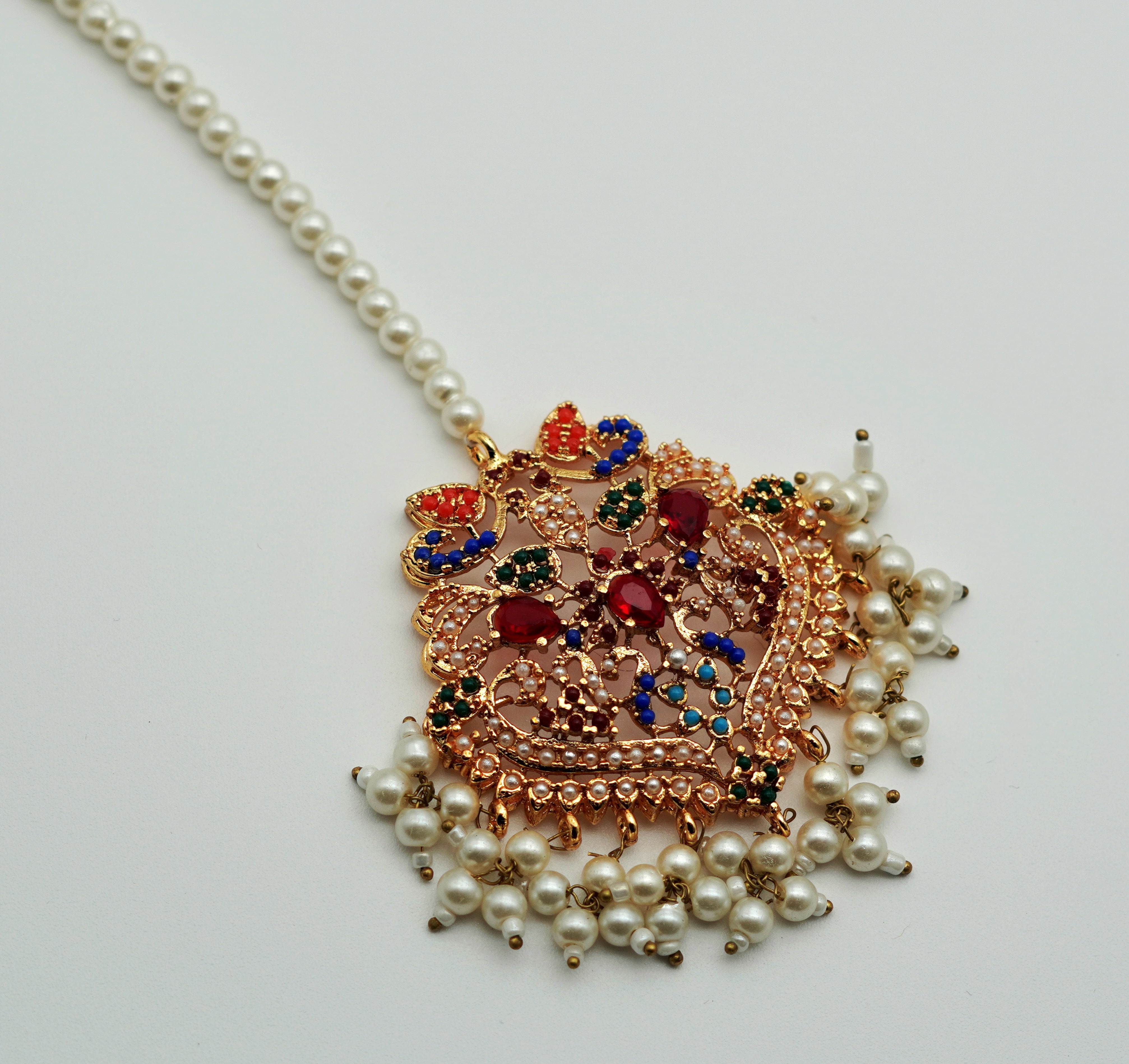 Adorned with ruby, emerald, sapphire, and pearl accents