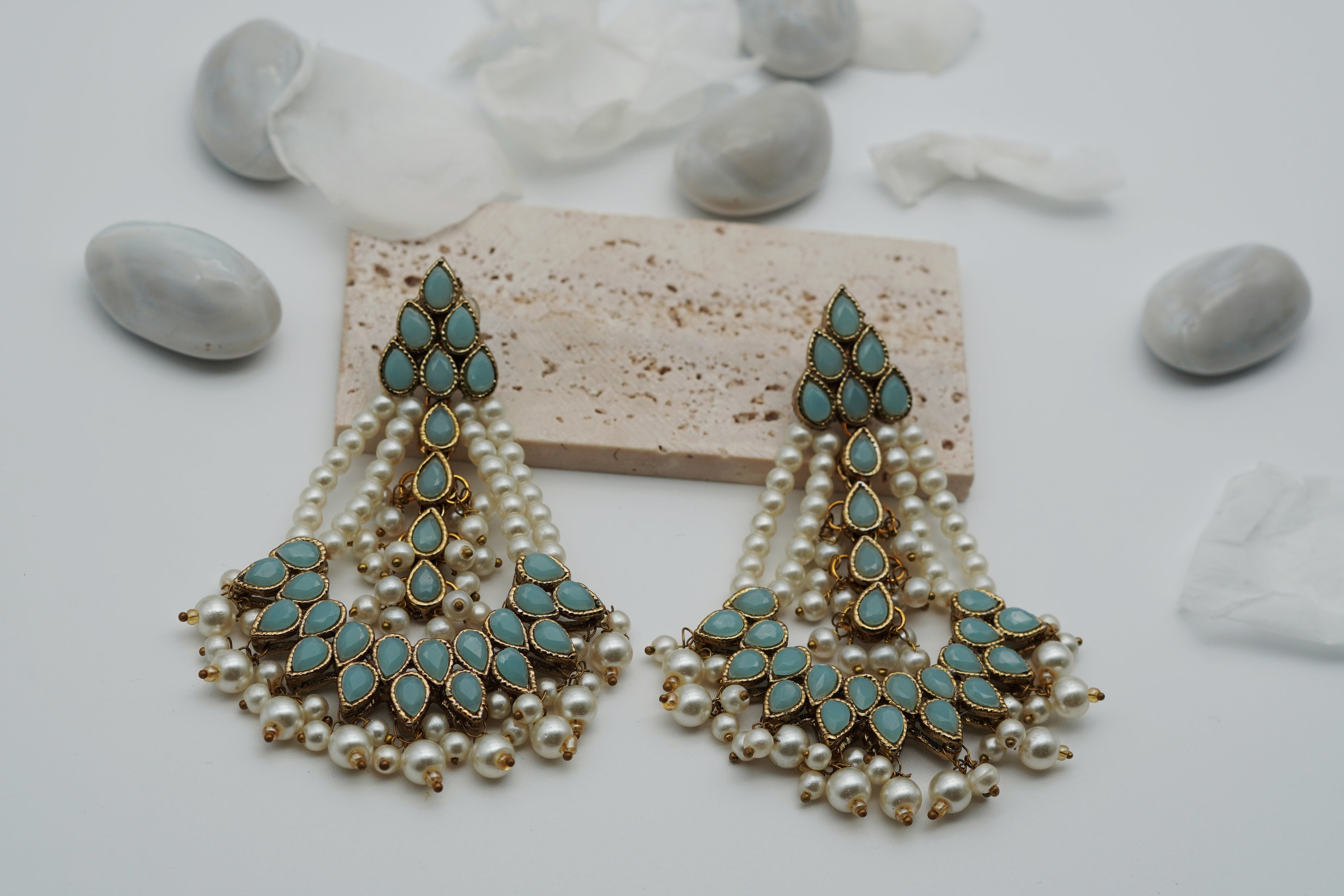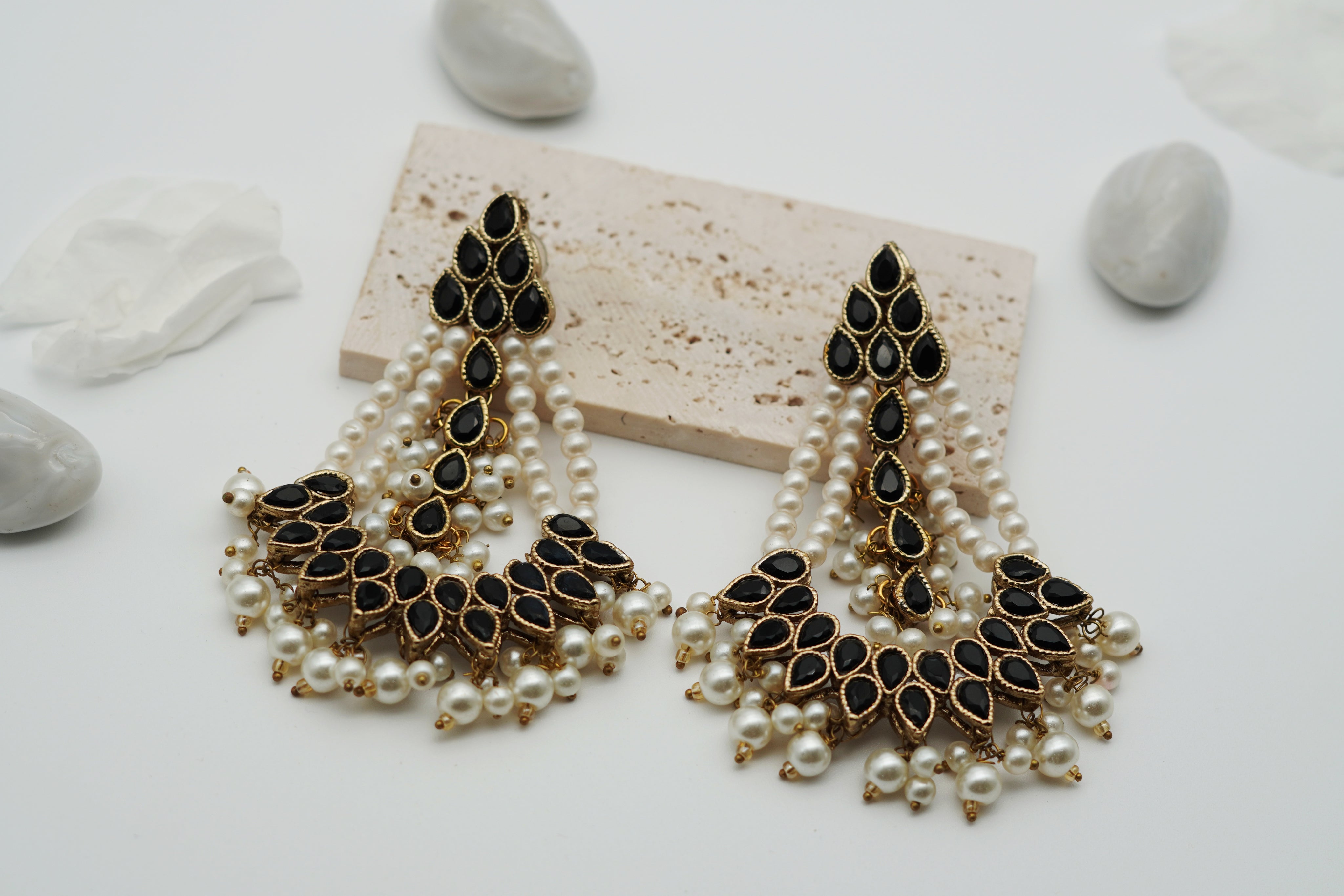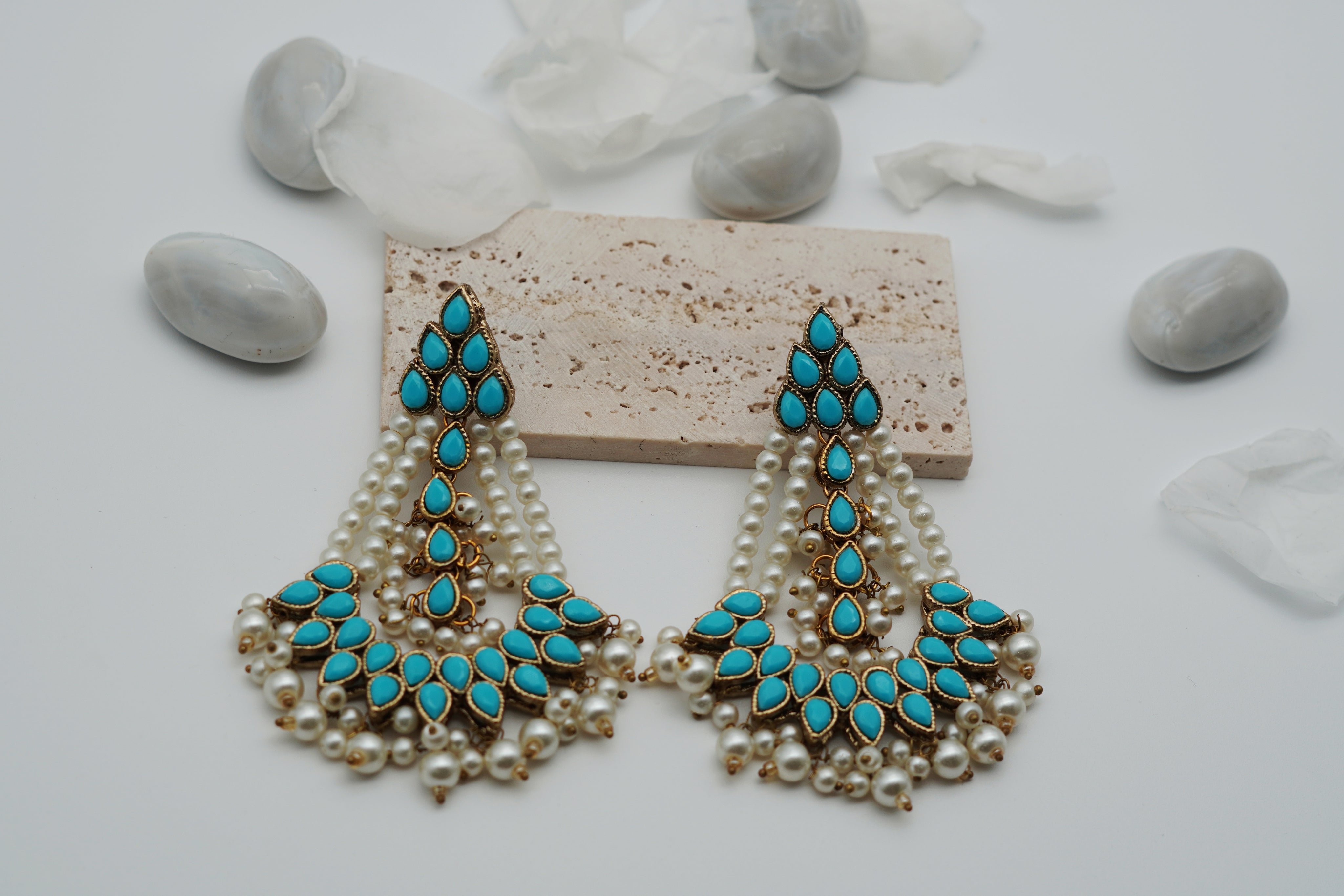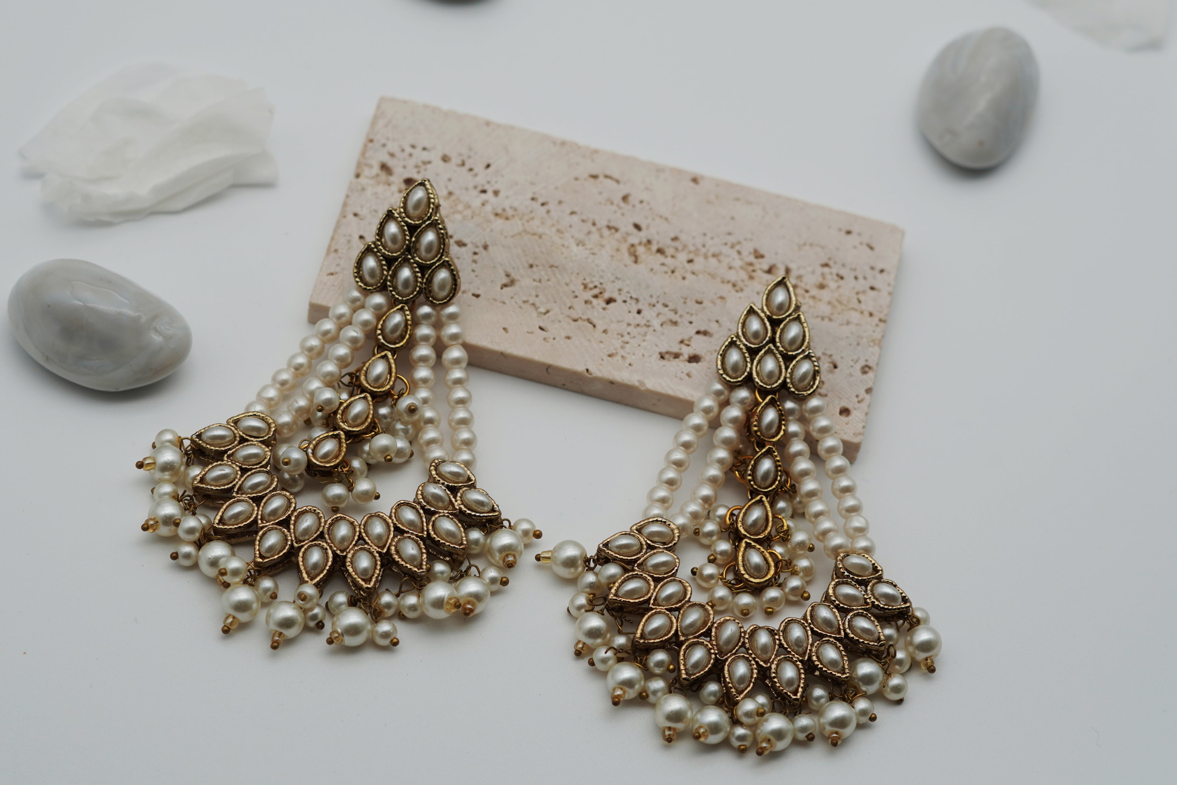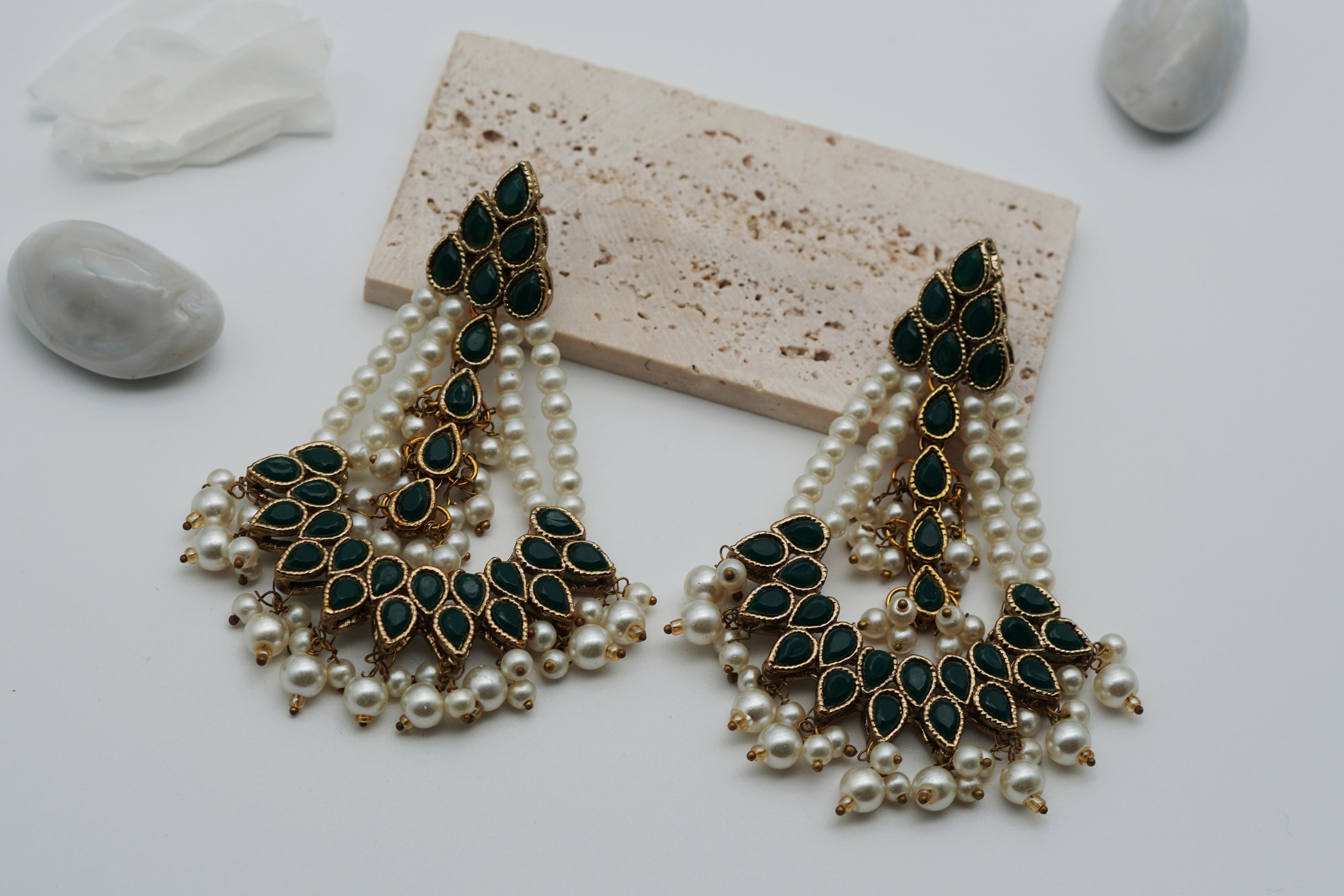 These exquisite handmade Kundan earrings feature a regal cascade design adorned with lustrous pearls and intricate Kundan detailing. The layered strings of pearls add a touch of vintage grandeur, while the teardrop-shaped Kundan stones reflect timeless craftsmanship. Perfect for weddings, festive occasions, or elegant evening wear, these statement earrings come in a variety of beautiful colors to complement any look.